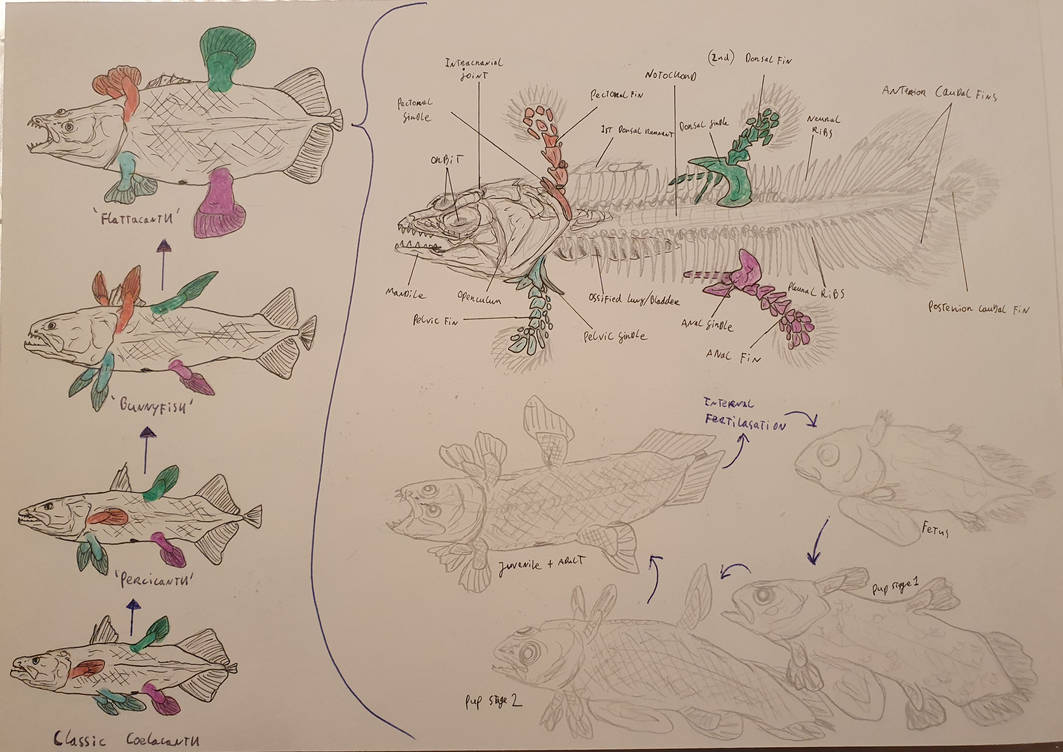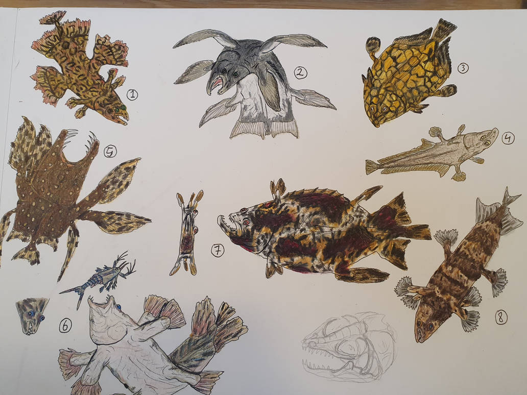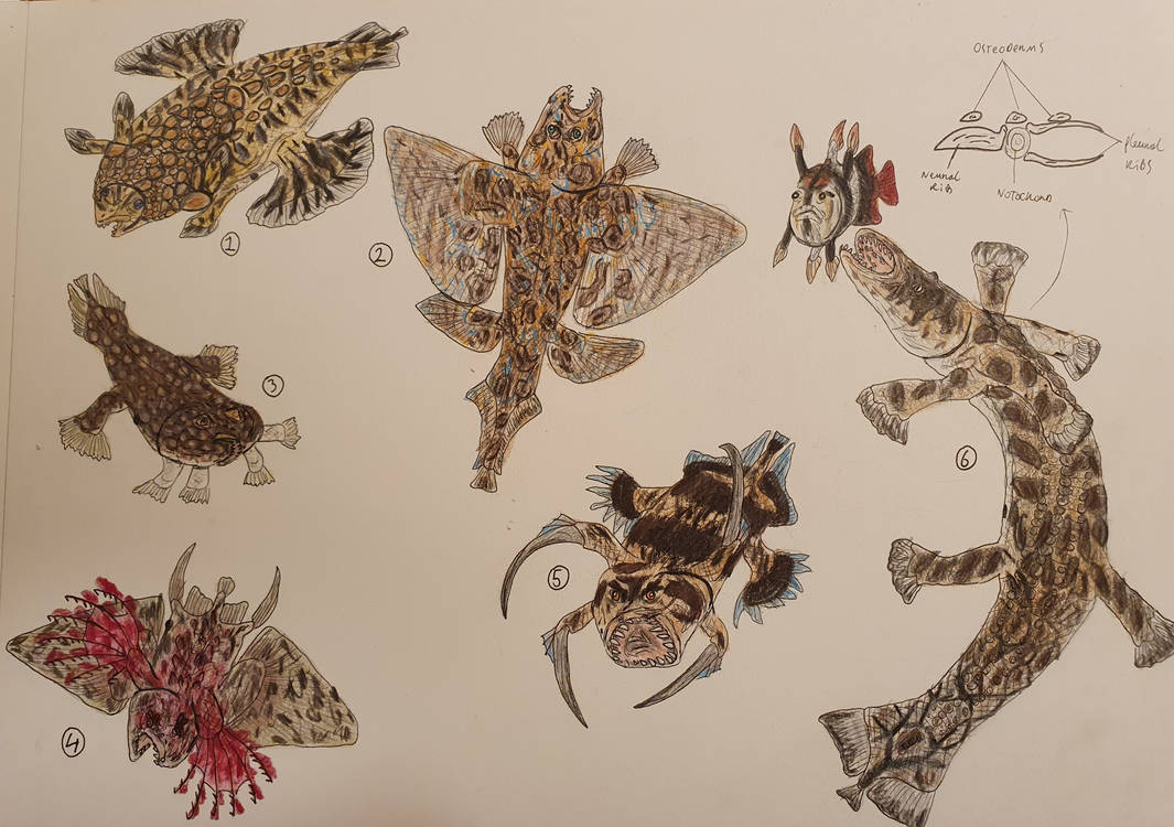 But, instead of becoming dorsoventrally flattened as most fish would, these already laterally flattened Lagotoichtyiiforms would instead evolve for life on the seafloor in a different way. Akin to the Pleuronectiformes of old Earth, these bunnyfish went through a cranial metamorphosis that saw one of their eyes migrate to the other side. This allowed them to skillfully lay flat on their sides on the sediment, becoming "flattacanths".